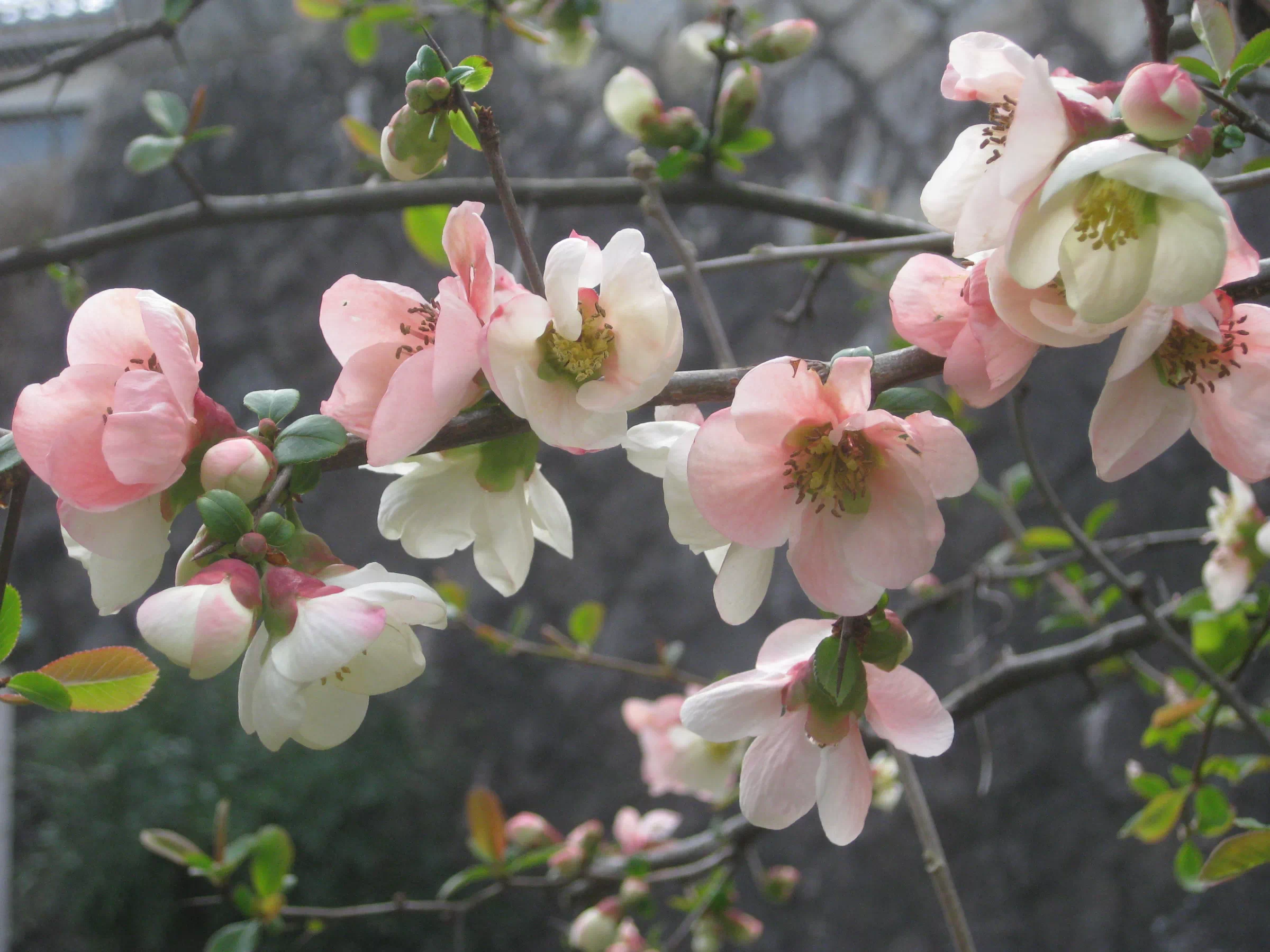 東側にはボケの花が満開です。